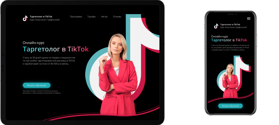 Была поставлена задача разработать структуру и дизайн сайта для онлайн-курса по таргету в TikTok, который привлекал бы заявки на обучение и служил посадочной страницей для таргета в Instagram. Нужен стильный дизайн и тексты, цепляющие аудиторию и закрывающие возражения.